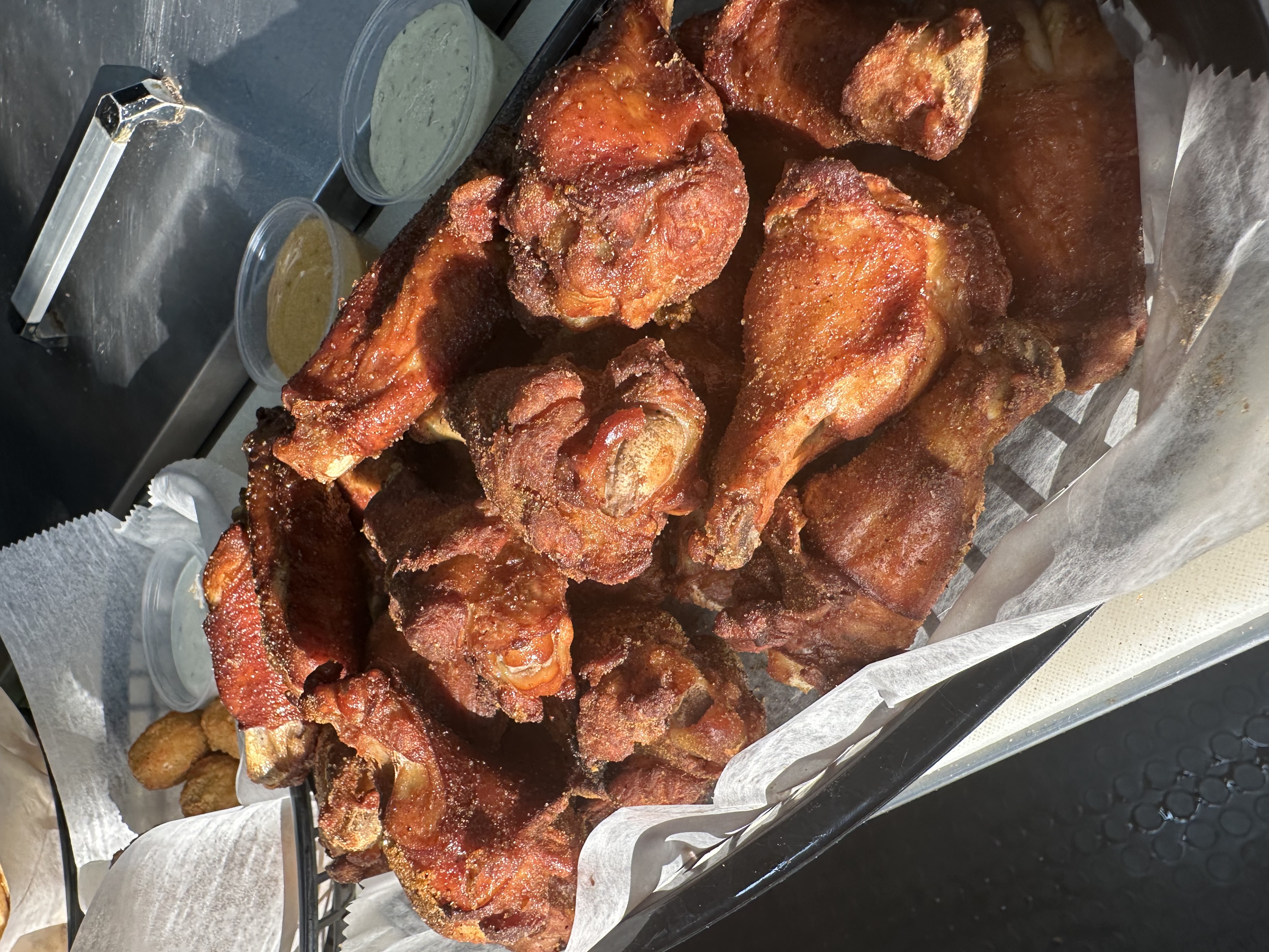 🍗 Standout item: the wings — smoked and fried to juicy perfection and offered with house sauces — are a go-to snack with your pint.